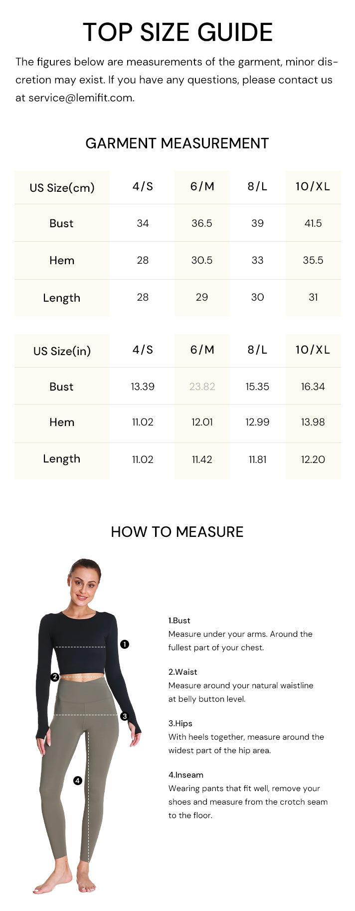 Model info: Lila Height 5'8'' Weight 114.6 lb / Bust 35.4'' Waist 23.6'' Hip 35.4''. Wear a size S (in between sizes? service@lemifit.com).