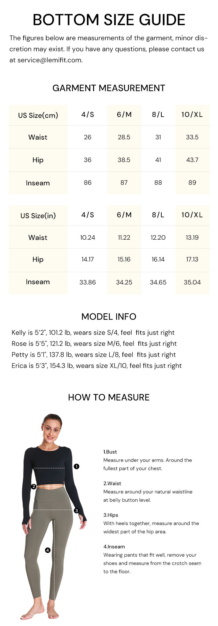 Model info: Cintia Height 5'8'' Weight 132.3 lb / Bust 34.3'' Waist 28.3'' Hip 39.4''. Wear a size S. (in between sizes? service@lemifit.com).